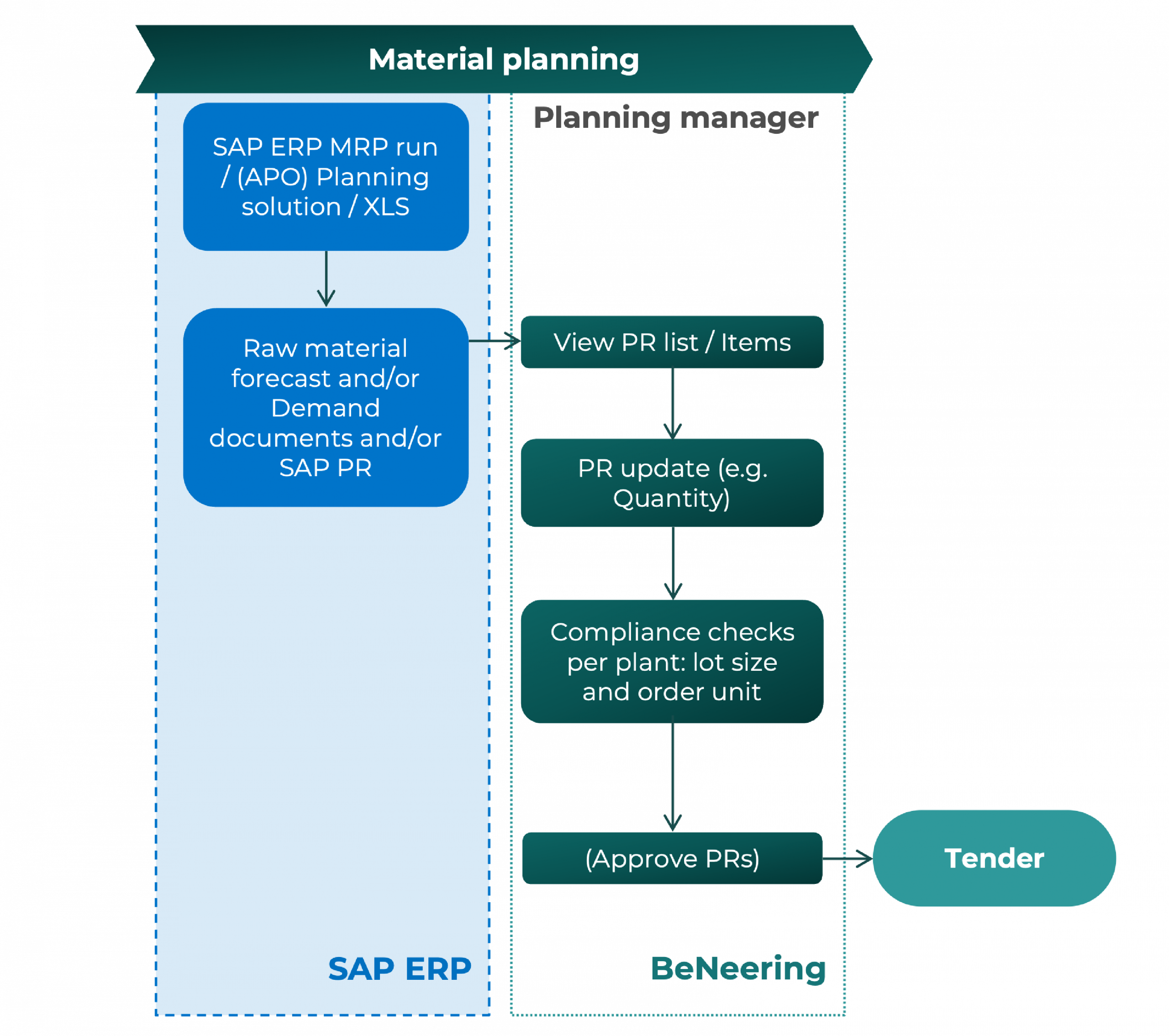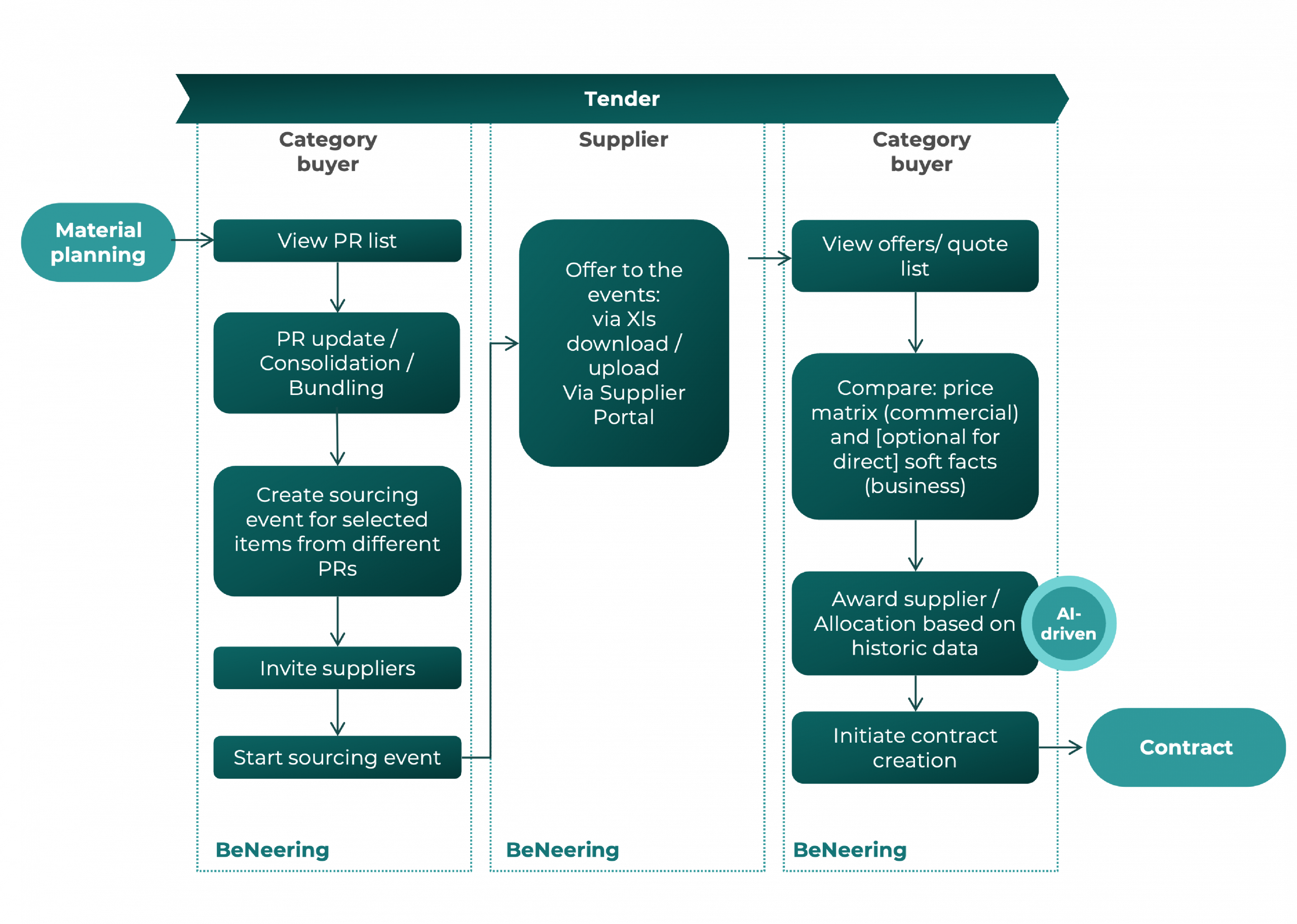 BeNeering Direct Materials Sourcing covers the complete end-to-end from Material Planning through Sourcing event (Tender) to Contract creation process from raw material demand through tendering to contract creation in SAP ERP, bridging the gap between MRP-driven demand and strategic supplier selection.