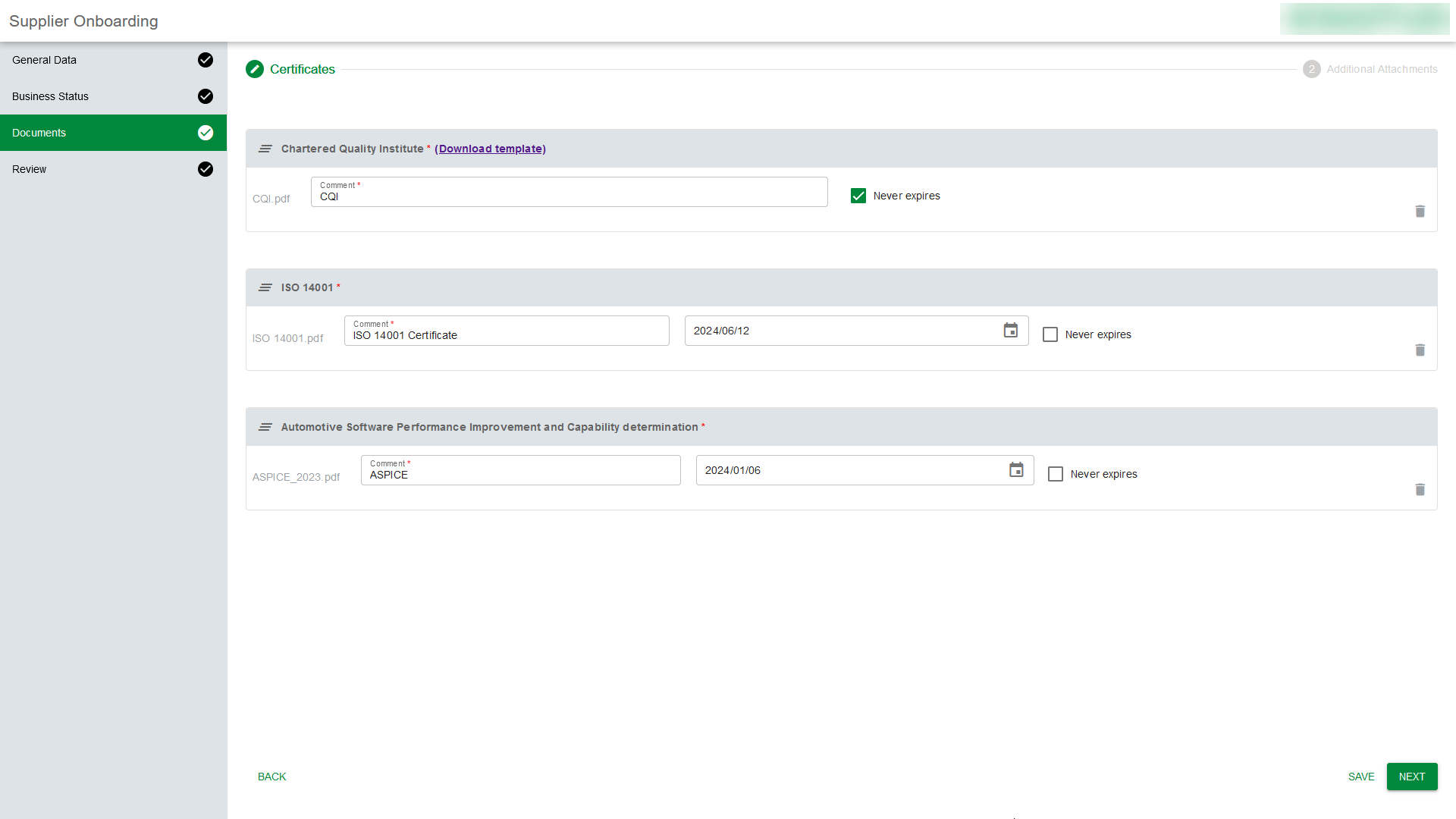 Automatically consider regional aspects such as legally required documents or information as well as technology-specific aspects like quality management requirements already in the initial supplier qualification to ensure compliance.