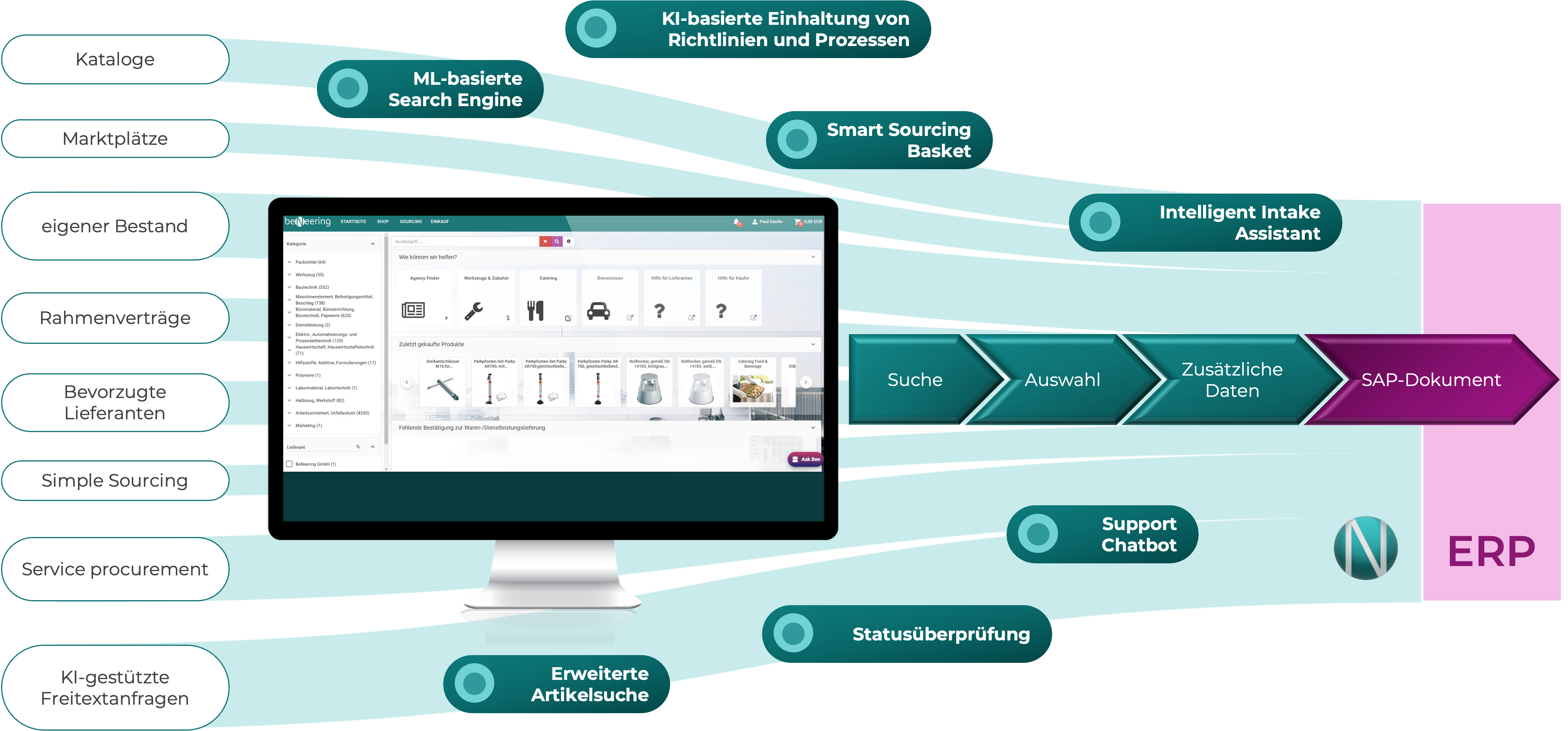 BeNeering AI arbeitet innerhalb Ihrer Prozesse und stützt sich auf Ihre Daten. Integrierte KI-Szenarien unterstützen den Anforderer während des gesamten Guided Buying-Einkaufsprozesses: Sie vereinfachen die Suche, gewährleisten die Einhaltung von Verträgen und nutzen historische ERP-Daten.